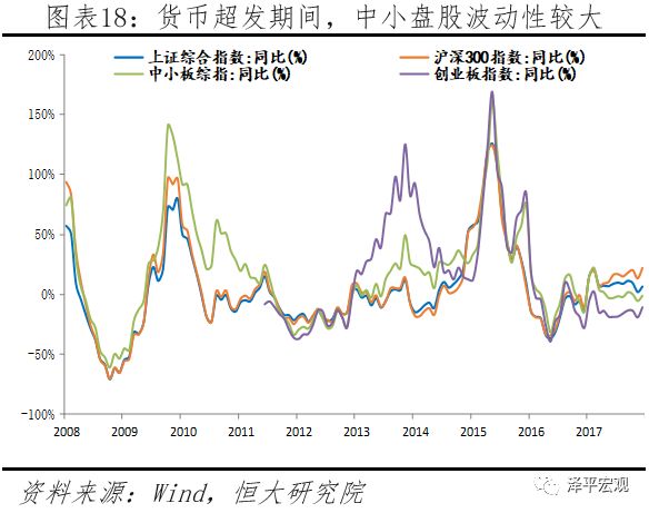 此外,中小盘股指在货币超发期间波动性显著大于大盘指数。2009-2017年间以中小板综指和创业板指数为代表的中小盘股指在货币超发年间波动性明显大于大盘股。我们认为这一方面与中小股投资者投资风格有关,另一方面中小盘股票实体企业及市值体量更易受到经济基本面、货币政策影响。
