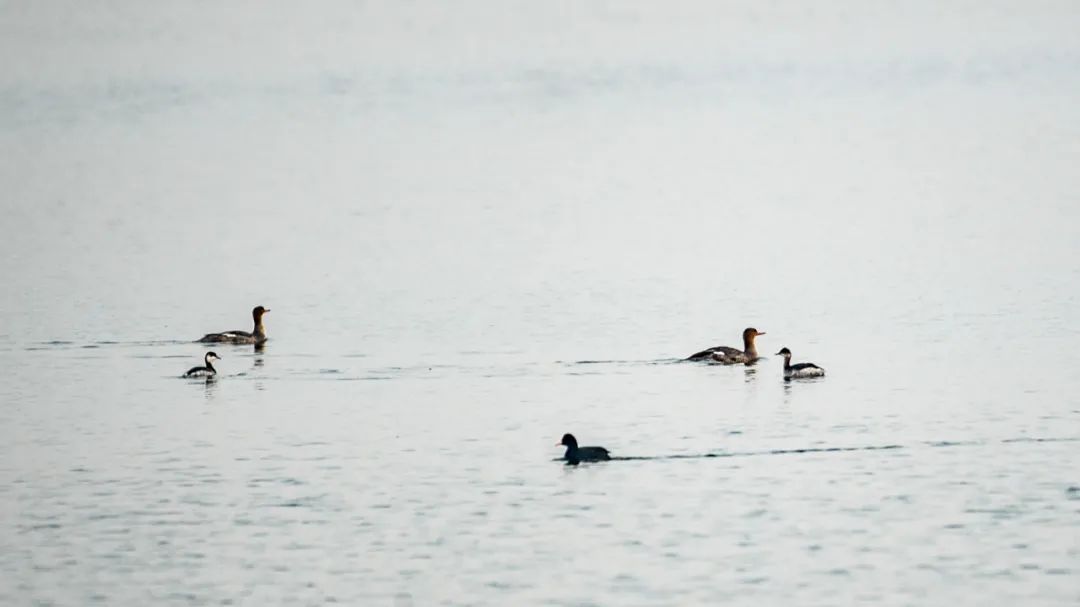 副会长虞磊告诉记者,这也是合肥首次发现这四种䴙䴘水鸟齐聚巢湖。而角鸊鷉和黑颈䴙䴘更是首次在合肥被记录到。