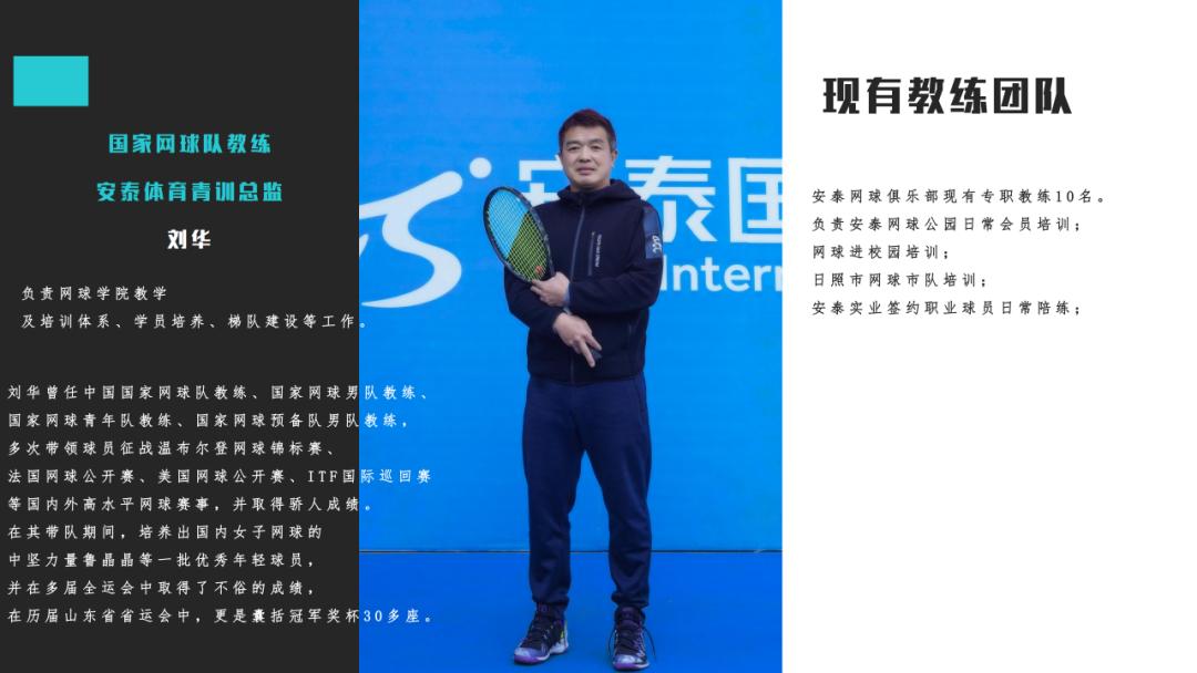 以国家队教练、安泰体育青训总监刘华为核心的安泰网球俱乐部教练团队,涵盖退役网球运动员 、各大体育院校专业教练,经验丰富、体系完善;并且中考考核网球项目的专项考核办法由安泰网球俱乐部参与制定。
