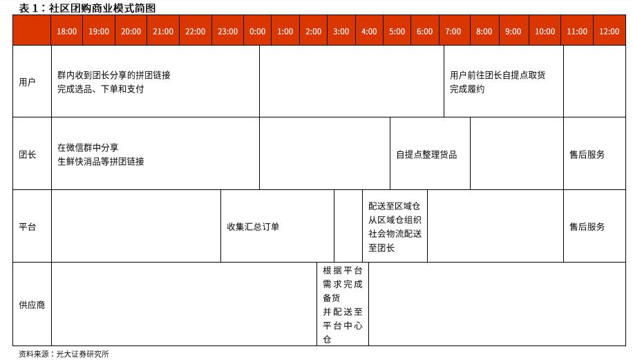 在模式上,经过前几年的探索,其实现在各玩家都大同小异。平台先招募一批“团长”,团长一般是某些实体门店的小老板或社区宝妈,兼职成为平台的销售员。团长以小区为单位建微信群,每天负责推送商品的小程序链接、引导用户下单,平台会把商品和配送都解决好,头一天的订单,第二天会送货到团长的提货点,然后团长通知用户来自提。