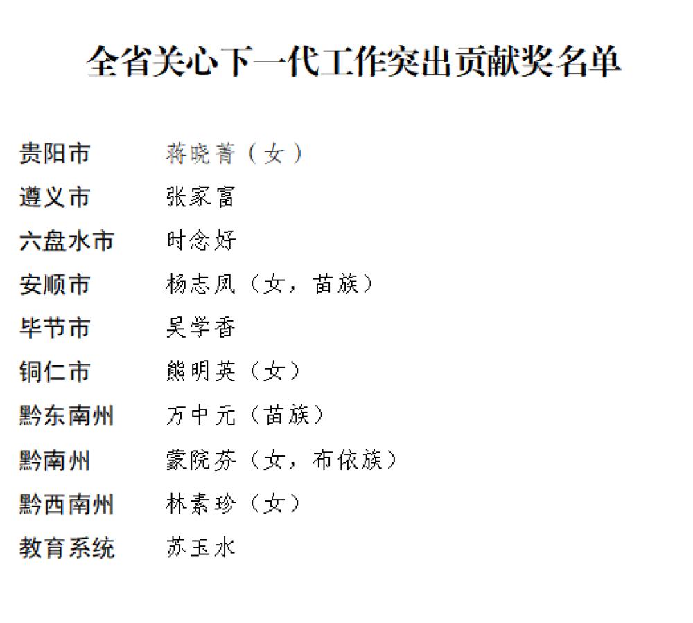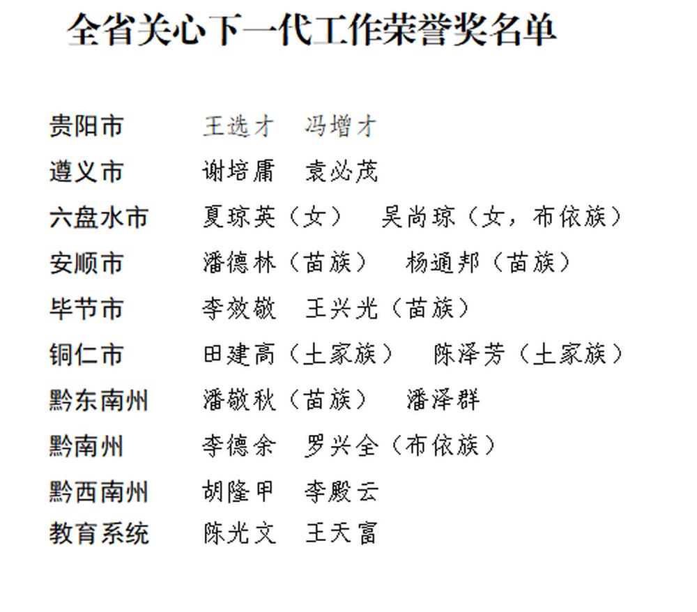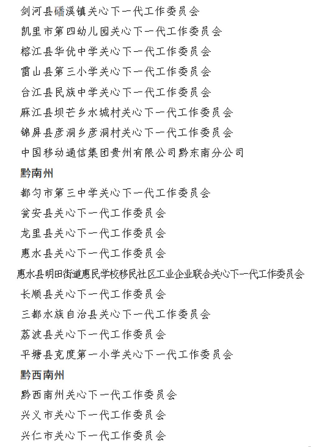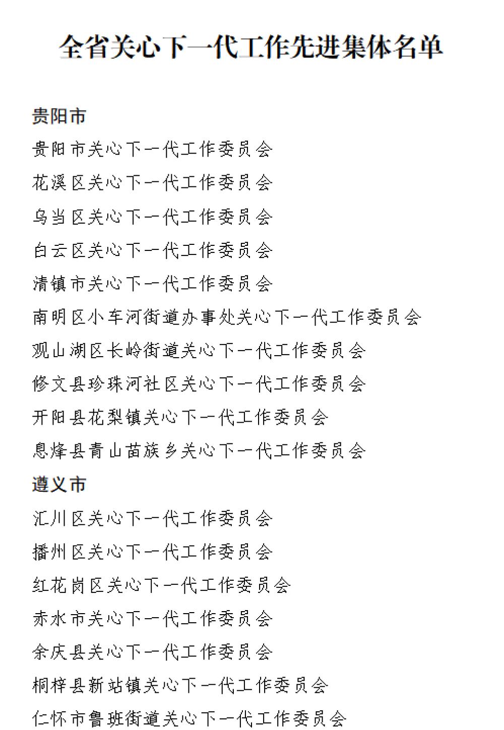 30年来,全省各级关工委涌现出一大批先进集体和先进个人。为表彰先进、宣传先进、学习先进,进一步凝聚起做好关心下一代工作的强大合力,经省委批准,省关工委和省精神文明办决定:授予贵阳市关工委等100个集体“全省关心下一代工作先进集体”称号,授予蒋晓菁等10名同志“全省关心下一代工作突出贡献奖”称号,授予王选才等20名同志“全省关心下一代工作荣誉奖”称号,授予刘正龙等300名同志“全省关心下一代工作先进工作者”称号。