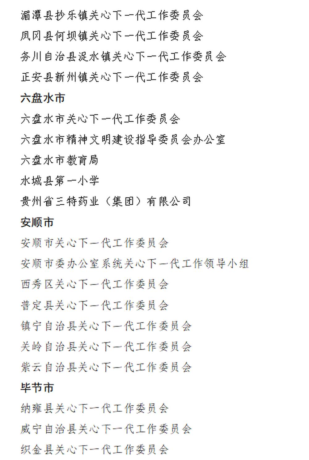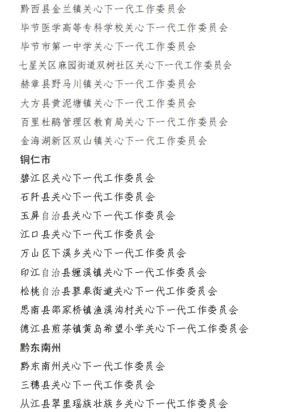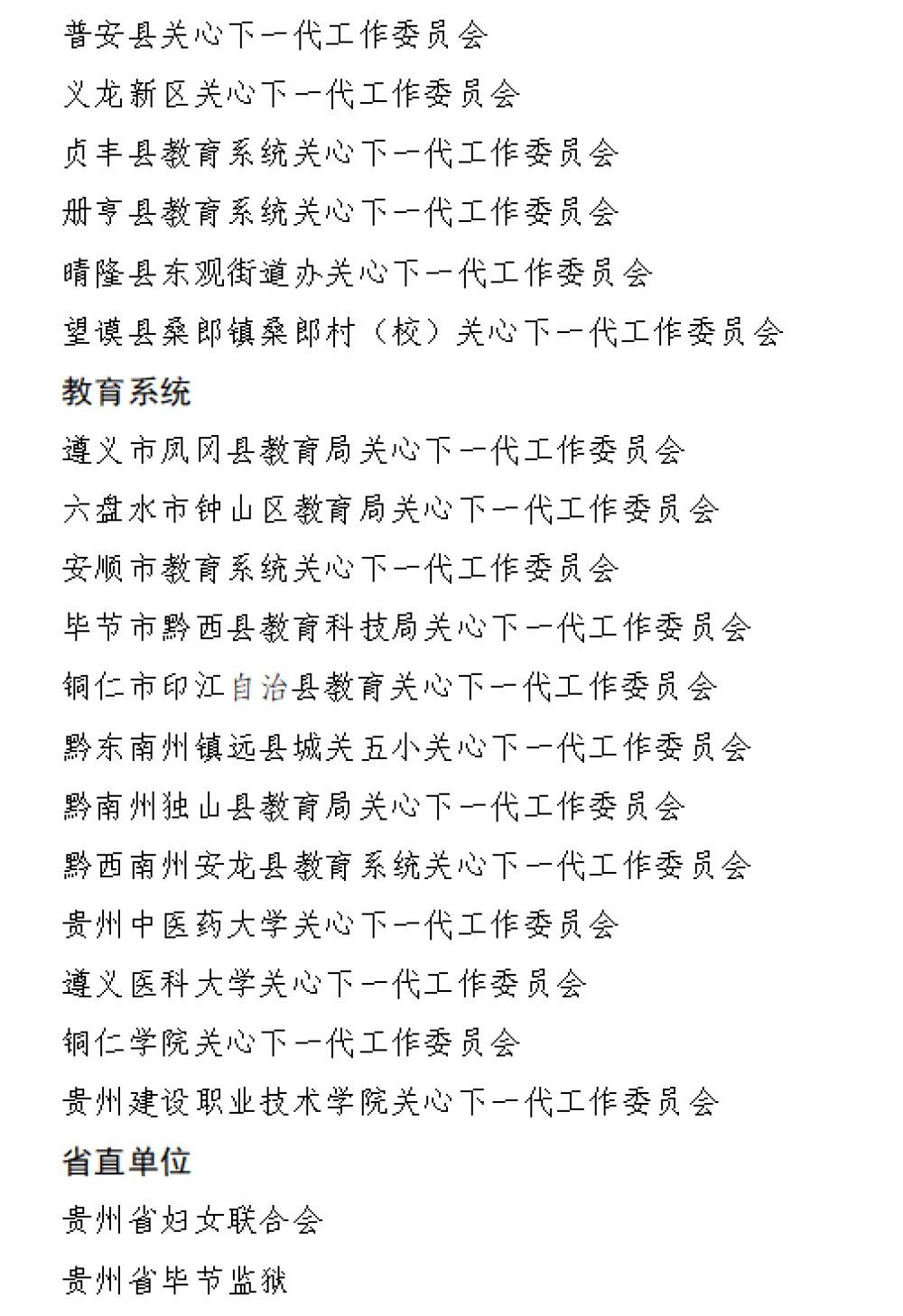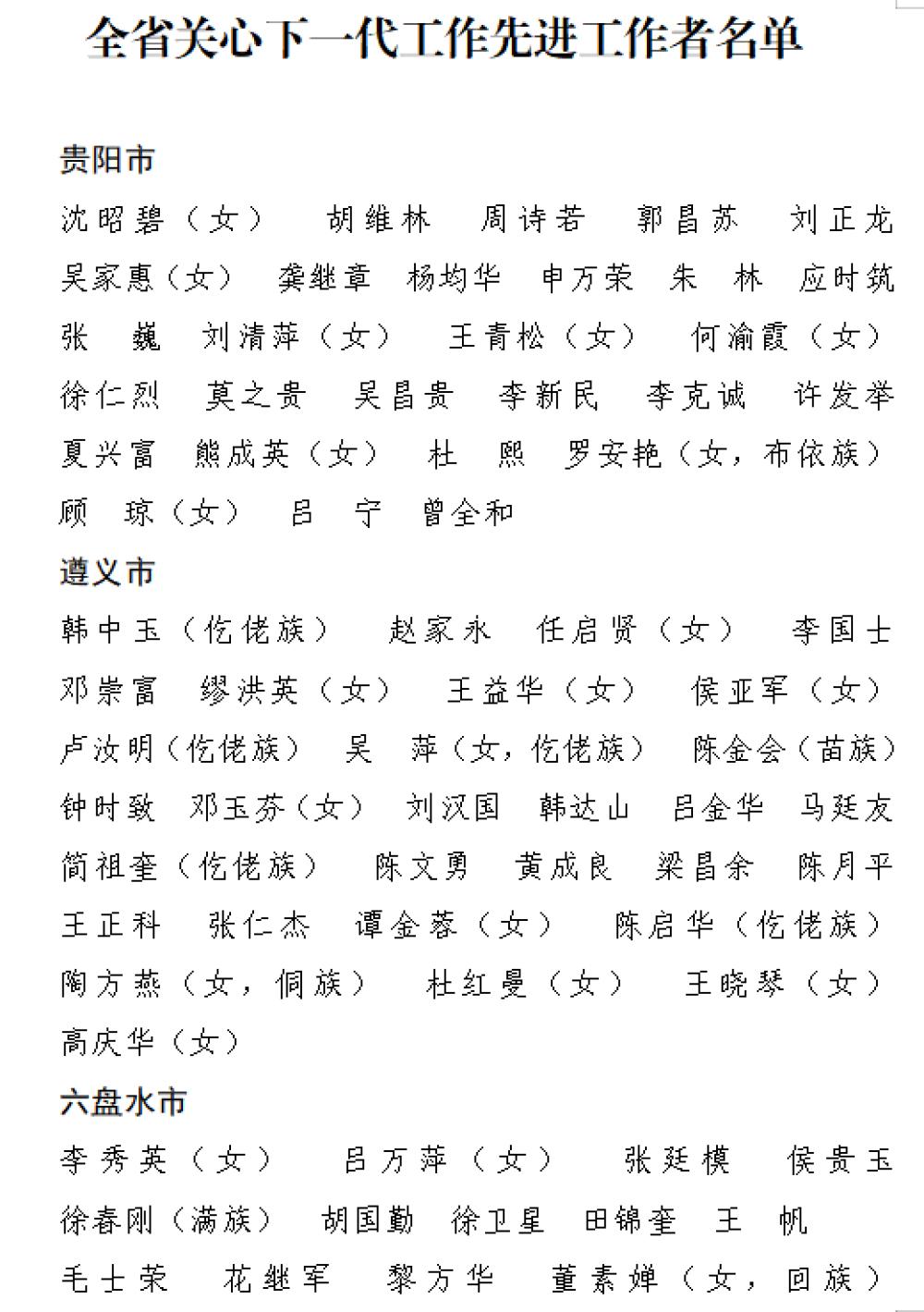 30年来,全省各级关工委涌现出一大批先进集体和先进个人。为表彰先进、宣传先进、学习先进,进一步凝聚起做好关心下一代工作的强大合力,经省委批准,省关工委和省精神文明办决定:授予贵阳市关工委等100个集体“全省关心下一代工作先进集体”称号,授予蒋晓菁等10名同志“全省关心下一代工作突出贡献奖”称号,授予王选才等20名同志“全省关心下一代工作荣誉奖”称号,授予刘正龙等300名同志“全省关心下一代工作先进工作者”称号。