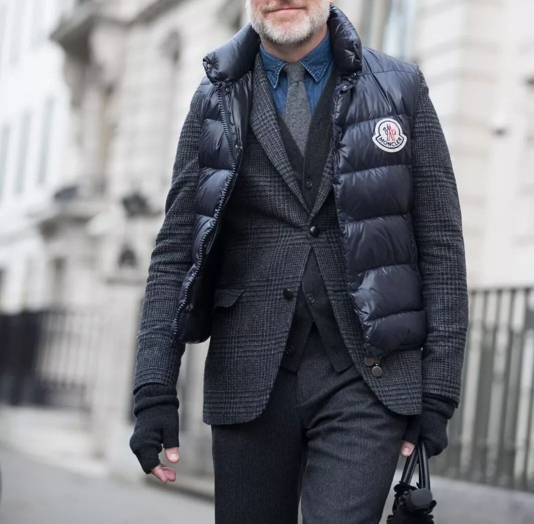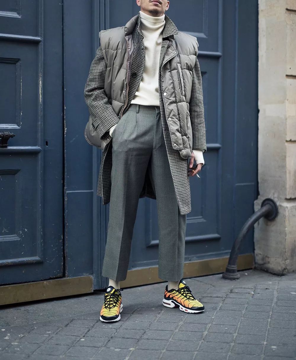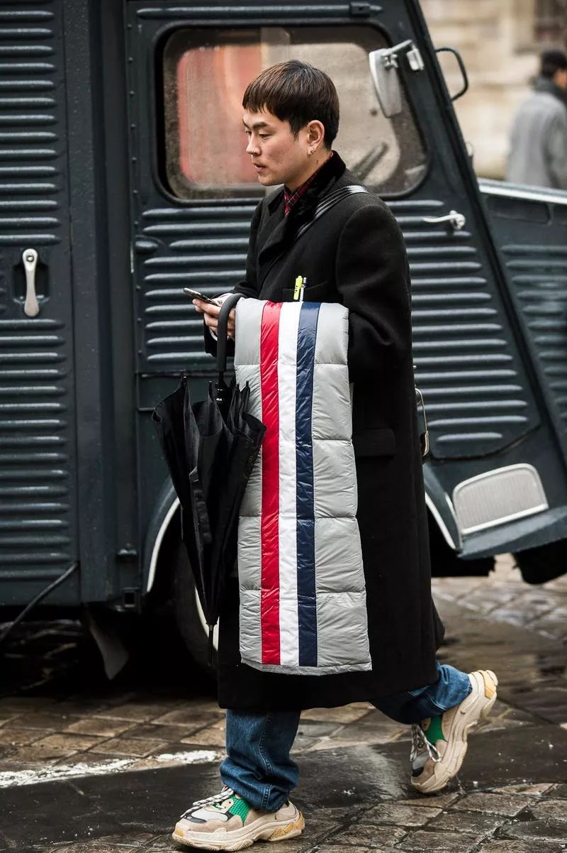 内搭多叠几个层次是有效在视觉上减轻羽绒服臃肿感的方法,可以尝试的方法包括在高领衫外叠穿一件衬衫,或是羽绒服里叠穿个西装、大衣。