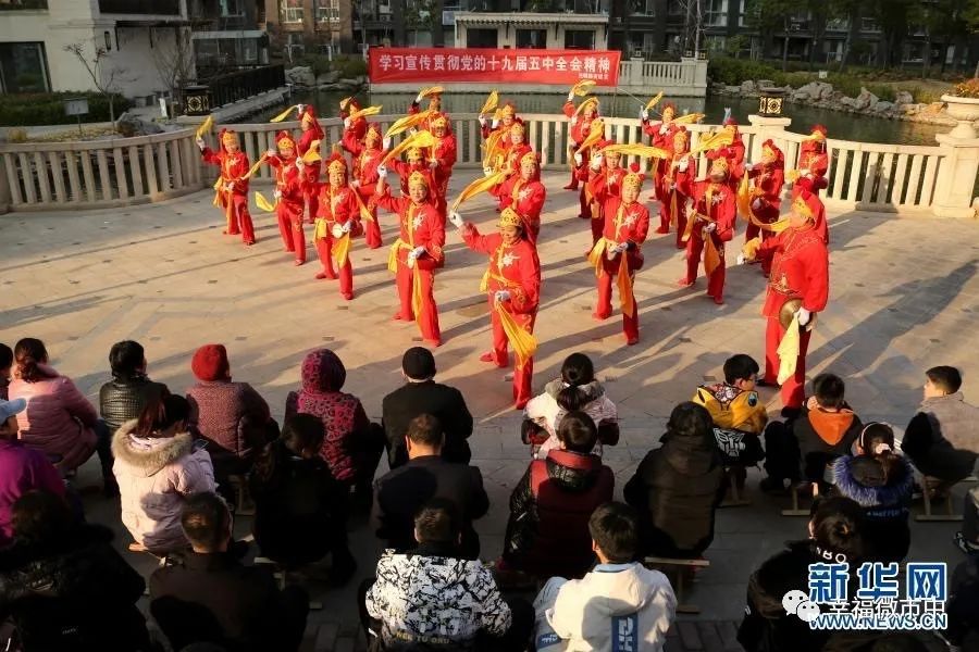 ▲12月6日,老年腰鼓队志愿者在山东省枣庄市市中区光明路街道远航社区为居民演出。