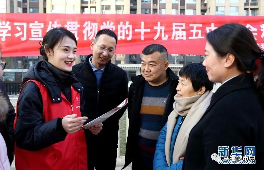 ▲12月6日,志愿者刘雨鑫(左一)在山东省枣庄市市中区光明路街道远航社区与居民交流,宣传党的十九届五中全会精神。