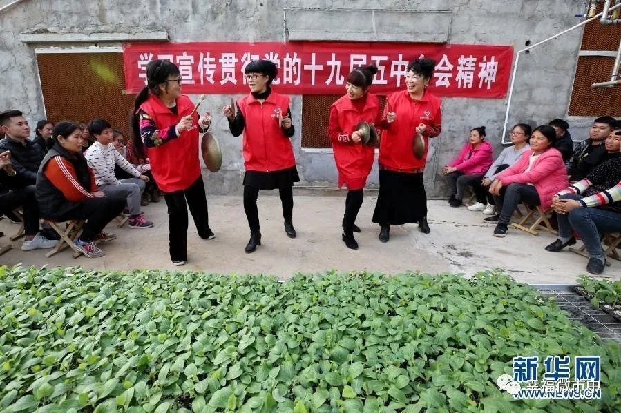 ▲12月5日,志愿者在山东省枣庄市市中区兴亮蔬菜农民专业合作社用三句半的表演形式向菜农宣传党的十九届五中全会精神。