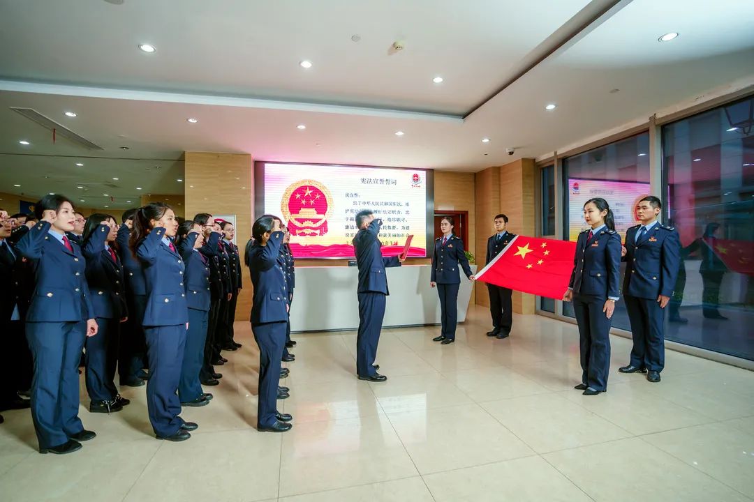 奉贤区税务局组织开展宪法宣誓仪式,在国旗的见证下,领誓人手抚宪法,右手举拳,领读誓词,青年干部代表面向国旗,列队站立跟诵誓词。税务干部纷纷表示要进一步在工作中增强宪法意识和法治思维,善于运用法治方式提高依法行政的能力和水平,更好地推动税收工作发展。