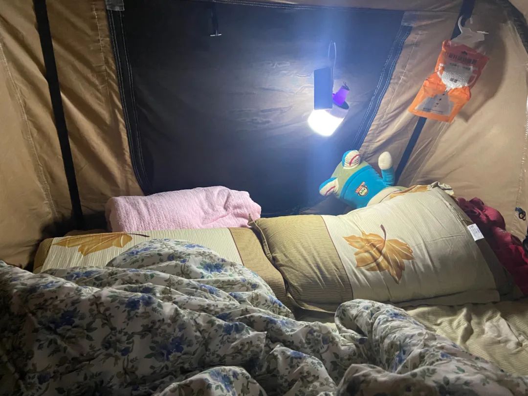 她一路从郑州开到小浪底,三门峡,又跑到西安住了一周。她从不走夜路,到了傍晚就找地方停车,花大概半个小时的时间搭好帐篷,晚上就睡在车顶。一路上,她住过空空荡荡的停车场、免费的房车露营地,还在高速服务站短暂停留过一晚。最开始她还害怕路人围观,吃饭要躲起来,后来慢慢习惯了各种目光,搭帐篷、收梯子,“动作行云流水”。
