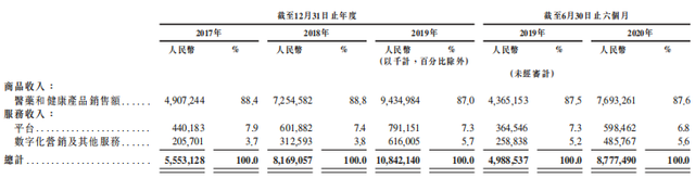 根据招股书,2017-2019年,京东健康分别实现营业收入55.53亿元、81.69亿元、108.42亿元,年复合增长率24.99%;2020年上半年,京东健康实现营业收入87.77亿元,同比增长75.93%。