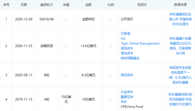 天眼查显示,2019年11月份,京东健康完成A轮融资,京东与CPE China Fund、中金资本和霸菱亚洲共同投资10亿美元,其中CPE China Fund是中信产业基金旗下美元基金,京东健康投后估值约70亿美元。