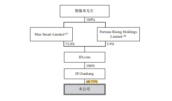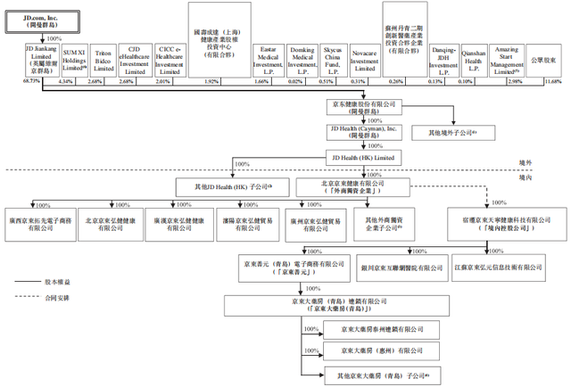 公开发行之后,京东集团通过全资子公司JD Jiankang持有上市公司68.73%股份,为京东健康控股股东。其他机构投资者有,高瓴资本旗下的SUM XI Holdings Limited 持有上市后的4.34%股权;霸菱亚洲投资旗下Triton Bidco Limited持股2.68%;中信产业投资基金旗下的CJD eHealthcare Investment Limited持股2.68%;中金旗下CICC e- Healthcare Investment Limited持股2.01%;中国人寿旗下国寿成达(上海)健康产业股权投资中心(有限合伙)持股1.92%;Eastar Medical Investment, L.P.持股1.66%。