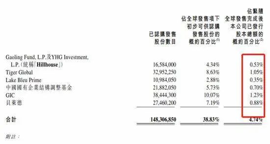 本次IPO,京东健康还引入了6名基石投资者,包括高瓴资本、Tiger Global、Lake Bleu Prime、中国国有企业结构调整基金、新加坡政府投资公司(GIC Pte)、贝莱德集团(BlackRock),合计认购,总额13.5亿美元(约104.67亿港元),占比38.83%,禁售期为6个月。