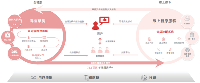 零售药房业务将用户群导向医疗健康服务,以进行在线问诊和处方续签。通过提供慢性病管理和家庭医生等服务,在线医疗健康服务能够预判用户需求、改善用户体验以及将用户流量重新导向零售药房业务,购买其他健康产品,如补品和医疗器械。