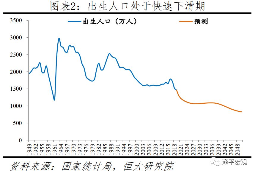 继2018年中国出生人口下降200万后,2019年出生人口再下降58万至1465万。新中国成立以来,中国先后出现三轮婴儿潮,分别为1950-1958年的年均2100万,1962-1975年的年均2628万,1981-1994年的2246万,之后逐渐下滑至2003-2012年的1600万上下,其中2012年为1635万。中国总和生育率从1970年代之前的6左右,降至1990年的2左右,再降至2010年后的1.5左右。第四轮婴儿潮原本应在2010年后出现,但因长期严格执行的计划生育而消失。在上述背景下,独生子女政策终于有所松动,2012年末中央决定实施单独二孩政策,但效果不及预期,2013-2015年出生人口分别为1640、1687、1655万。2015年末中央决定全面放开二孩,出生人口在2016年达1786万、创2000年以来峰值;但2017年即下滑至1725万,2018年再下降200万至1523万,2019年为1465万。