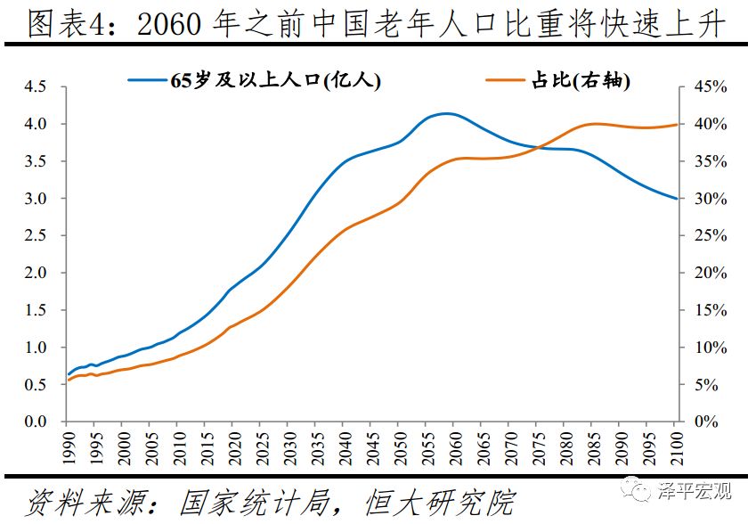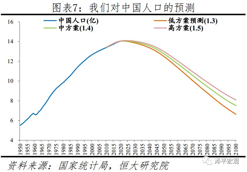 2019年中国出生人口降至1465万,65岁及以上人口占比达12.6%,人口总量在“十四五”时期将不可避免进入负增长。人口因素变化缓慢但势大力沉,按照当前趋势,随着全面二孩政策效应彻底消失、受教育水平提高、城市化推进等,未来总和生育率将从2019年的1.5下滑至1.0-1.2左右。以总和生育率1.0估计,到2050、2100年总人口将分别为12.1、5.2亿,老人比重分别为31.2%、53.4%。即使以总和生育率1.4稍乐观估计,到2050、2100年总人口将分别为12.7、7.3亿,老人比重分别为29.6%、40.7%。