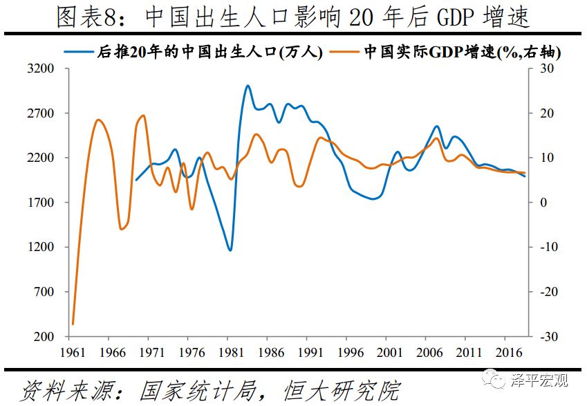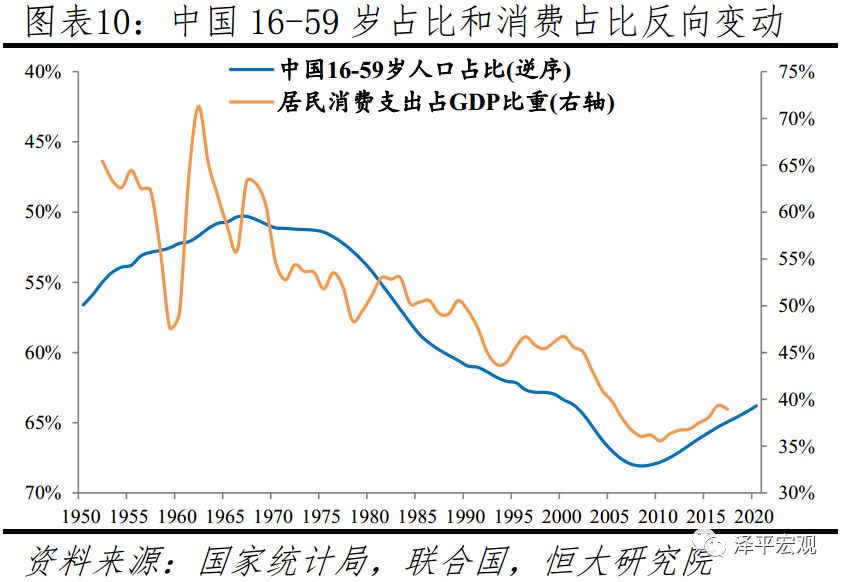 从经济增长看,劳动年龄人口比例已于2010年见顶,预计2050年比2019年减少23%;2010-2018年中国经济增速已从10.6%降至6.1%,即将进入“5时代”。人口数量红利是过去中国经济保持高速增长的一个重要因素。1978年改革开放后,中国依靠庞大且年轻的劳动力资源,以及与之相关的巨大统一市场,快速成长为世界第二大经济体。1962-1975年第二轮婴儿潮人口是改革开放40年的建设主力,生产和储蓄多,消费少,导致储蓄率和投资率上升,储蓄超过投资部分产生贸易顺差,同时过剩的流动性和人均收入水平提高推动消费升级,经济潜在增速较高。但是,在长期低生育率背景下,中国15-64岁劳动年龄人口比例及规模分别在2010、2013年见顶,人口数量红利消失,导致中国经济潜在增速下行,推动中国经济增速换挡。2010-2019年,中国经济增速从10.6%逐渐降至6.1%,即将进入“5时代”。从绝对水平看,当前中国人口总抚养比约40%,未来一段时间仍处于人口负担相对较轻的“人口机会窗口期”(小于50%)。根据2010年中国人口普查资料,80后、90后、00后人口分别为2.19亿、1.88亿、1.47亿,90后比80后少约3100万,00后比90后少4100万。预计2050年将较2019年减少2.3亿至7.6亿,即减少约23%。随着劳动力供给总量持续萎缩,劳动力成本日益上升,部分制造业已经开始并将继续向东南亚、印度等地迁移。