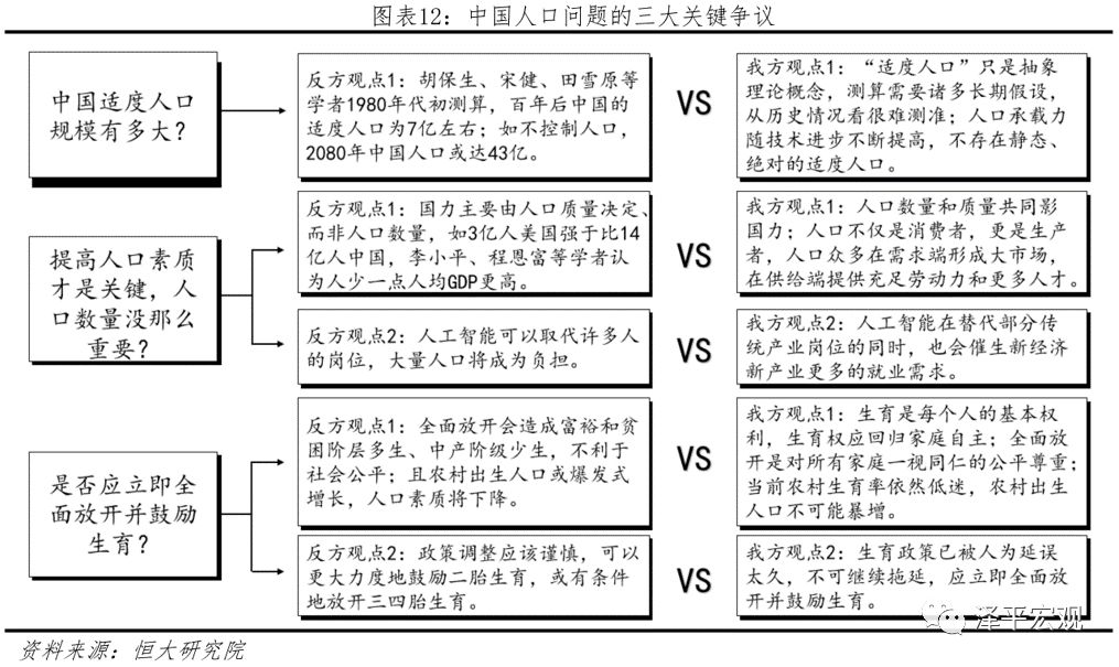 中国人口三大流传甚广的错误认识。1)中国适度人口规模有多大?反方观点:胡保生、宋健、田雪原等学者1980年代初测算,百年后中国的适度人口为7亿左右;如不控制人口2080年中国人口或达43亿。我们认为,“适度人口”只是一个抽象理论概念,测算需要诸多长期假设,从历史情况看很难测准。人口承载力随着技术进步不断提高,不存在静态、绝对的适度人口。2)提高人口素质才是关键,人口数量没那么重要?反方观点1:国力主要由人口质量决定、而非人口数量,李小平、程恩富等学者认为人少一点人均GDP更高。我们认为,人口数量和质量共同影响国力。人口不仅是消费者,更是生产者,人口众多在需求端形成大市场,在供给端提供充足劳动力和更多人才。反方观点2:人工智能将取代许多人的岗位,大量人口将成为负担。我们认为,人工智能在替代部分传统产业岗位的同时,也会催生新经济新产业更多的就业需求。3)是否应立即全面放开并鼓励生育?反方观点1:全面放开生育将造成富裕和贫困阶层多生、中产阶级少生,不利于社会公平;且农村出生人口或爆发式增长,人口素质将下降。我们认为,生育是每个人的基本权利,生育权应回归家庭自主;全面放开是对所有家庭一视同仁的公平尊重;当前农村生育率依然低迷,农村出生人口不可能暴增,农村出生人口也不等于低素质人口。反方观点2:政策调整应该谨慎,可以更大力度地鼓励二胎生育,或有条件地放开三四胎生育。我们认为,翟振武等人曾估计“全面二孩”将使出生人口峰值达4995万,生育政策已被人为延误太久,不可继续拖延,应立即全面放开并鼓励生育。
