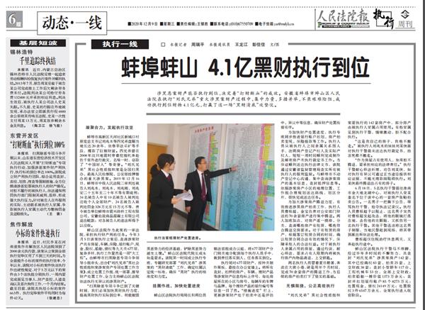涉黑恶案财产能否执行到位,决定着“打财断血”的成效。安徽省蚌埠市蚌山区人民法院在执行“刘氏兄弟”重大涉黑案财产过程中,集中力量,多措并举,不畏艰难险阻,成功执行到位财物4.1亿元,打赢了这一场“黑财清底”攻坚仗。