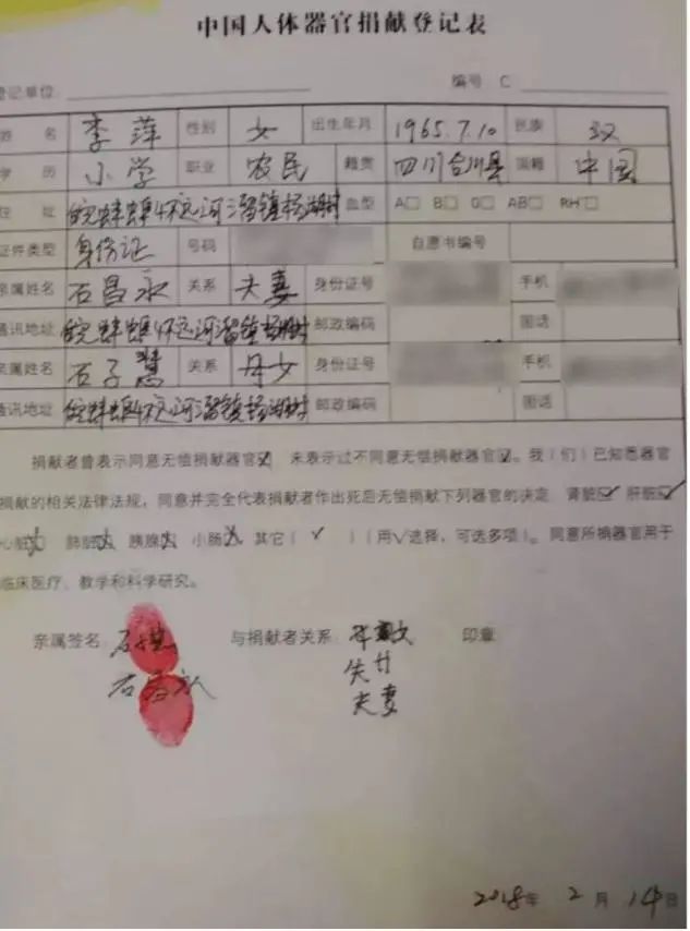 "当时家里出事,一家四口被砍伤,我还躺在病床上,都等着钱救命,他们就签字了。"但这张有父亲和妹妹签名的"中国人体器官捐献登记表"里,石祥林发现,表上既没有单位,也没有公章。