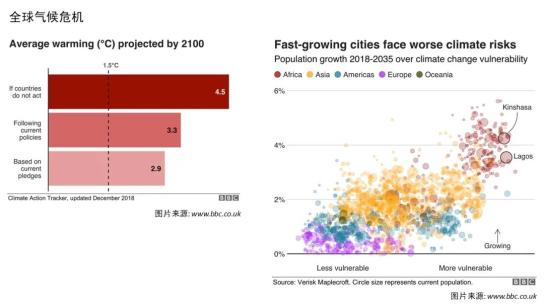 由于人为活动的温室气体排放造成的全球气候变暖已是不争的事实。联合国警告将全球变暖控制在不超过工业革命前2摄氏度的目标已很难实现,因为包括美国和欧盟在内的大经济体都没能到达他们承诺的减排目标。有关研究指出95%可能遇到极端气候风险的城市坐落于非洲和亚洲。