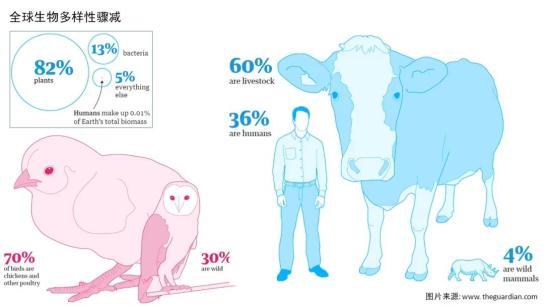 有关研究指出,在全球生物总量中,人类只占总重量的0.01%。但是,人类却消灭了世界上83%的野生哺乳动物。现在地球上所有的哺乳动物,96%是人和人类饲养的牲畜,只有4%是野生哺乳动物。而地球上所有的鸟类,70%是人类饲养的禽类,只有30%是野生鸟类!