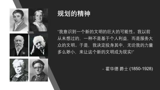 现代城市规划奠基人,“田园城市之父”霍华德爵士(Sir Ebenezer Howard)曾说到,“我意识到一个新的文明的巨大的可能性。我以前从未想过的,一种不是基于个人利益,而是服务大众的文明。于是,我决定投身其中,无论我的力量多么渺小,来让这个新的文明成为现实!”