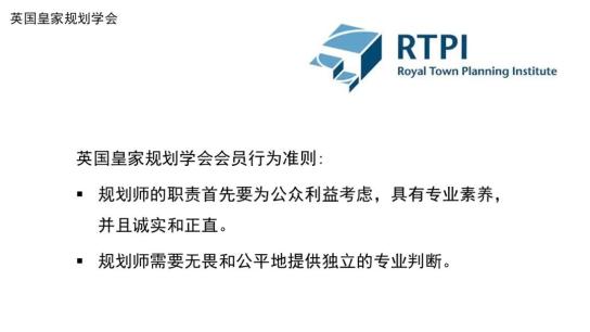 秉承学会建立的服务公众的初衷,英国皇家规划学会会员行为准则要求会员首先为公众利益考虑,并且需要无畏和公平地提供独立的专业判断,这一要求与律师单一为客户利益服务的情况有质的区别。然而,近年来随着客户类型和行业分工的高度细化,规划师如何确保高度的职业道德要求,也时常受到挑战。