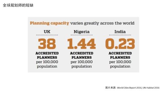 在全球城镇化的大背景下,目前发展最快的国家和地区却常是规划师最短缺的地方。根据联合国人居组织的报告,英国每10万人平均有38位规划师,而在21世纪末将成为全球人口第一大国的尼日利亚,每10万人平均只有1.44位规划师,而在印度每10万人平均只有0.23位规划师。目前预计,全球2030年前要实现城镇化的地方尚有60%未建设,全球规划师队伍急需大量人才和先进的规划理念。
