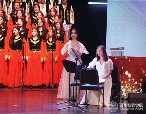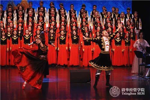 在创编过程中,指挥赵冰玉力求在保留原作精髓的前提下充实原曲的艺术感染力,加入了丰富多变的四声部和声。女高清亮,女中婉转;男高恢弘,男低深沉。四声部的旋律交织融合,奏响一曲和谐而大气的赞歌。为丰富歌曲的听觉与视觉效果,指挥加入了多种元素:浑厚的大提琴如同矗立远方的神秘雪山,柔美的小提琴如同浇灌牧场的蜿蜒冰川;伴着清脆的铃鼓,仿佛看到了草原上奔腾的骏马,伴着优美的音束,仿佛揭开了帕米尔姑娘的面纱;长笛一曲入云霄,好似翱翔的雄鹰,手鼓击出太阳红,好似豪爽的汉子;伴舞的脚步像白云之下翩跹的飞鸟,钢琴的乐音像春风拂过灵动的草原……同学们运用如此丰富的表现形式表达了对祖国大好河山的赞美之情以及对祖国未来的美好祝愿。现场演出中,同学们精神饱满、斗志昂扬,不仅准确地处理了歌曲的音高与节奏,更让饱满的感情迸发而出、回荡新清,震撼全场观众,获得热烈掌声。