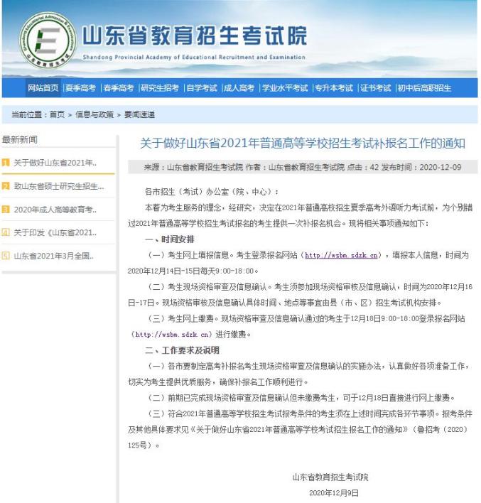 刚刚,山东省教育招生考试院发布了《关于做好山东省2021年普通高等学校招生考试补报名工作的通知》,之前错过报名的考生,可以在2020年12月14日-15日每天9:00-18:00填报本人信息,2020年12月16日-17日考生须参加现场资格审核及信息确认,12月18日9:00-18:00登录报名网站(http://wsbm.sdzk.cn)进行缴费。提醒各位还未完成高考报名的考生一定要把握住这次机会。接下来我们一起来看看具体安排。