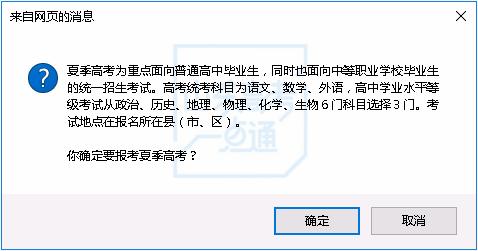 点击上图“报考夏季高考”按钮,系统再次提示并请考生确认是否报考夏季高考,如下图: