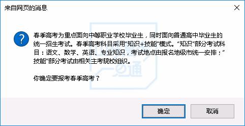 点击“春、夏季高考选择”页面“报考春季高考”按钮,系统再次提示并请考生确认是否报考春季高考,如下图: