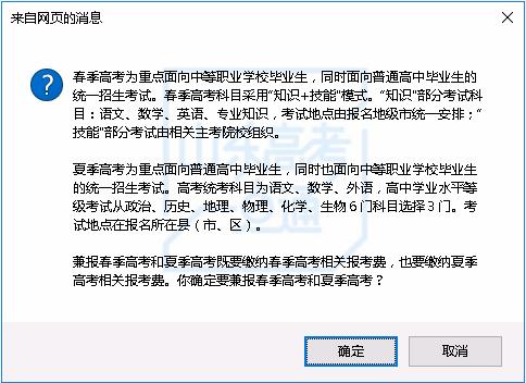 点击“春、夏季高考选择”页面“兼报春季和夏季高考”按钮,系统再次提示并请考生确认是否兼报春季和夏季高考,如下图: