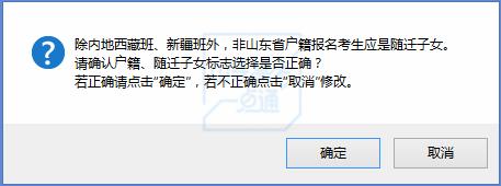 说明5:若考生报考夏季高考、户籍选择非山东省且是否随迁子女选择“否”,系统会提示考生确认户籍、随迁子女选项是否正确,如下: