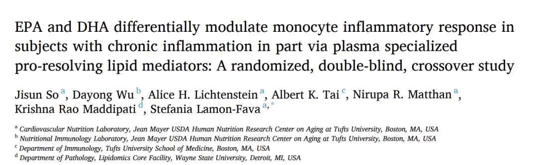 Jisun So et al, EPA and DHA differentially modulate monocyte inflammatory response in subjects with chronic inflammation in part via plasma specialized pro-resolving lipid mediators: A randomized, double-blind, crossover study, Atherosclerosis (2020).