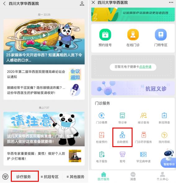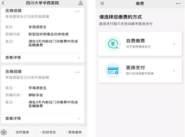 可通过华西医院微信公众号自助开单、缴费,或到急诊科外的1号帐篷开具新冠检查项目。在2号帐篷打印条码后,在2、3、4号帐篷完成采样。