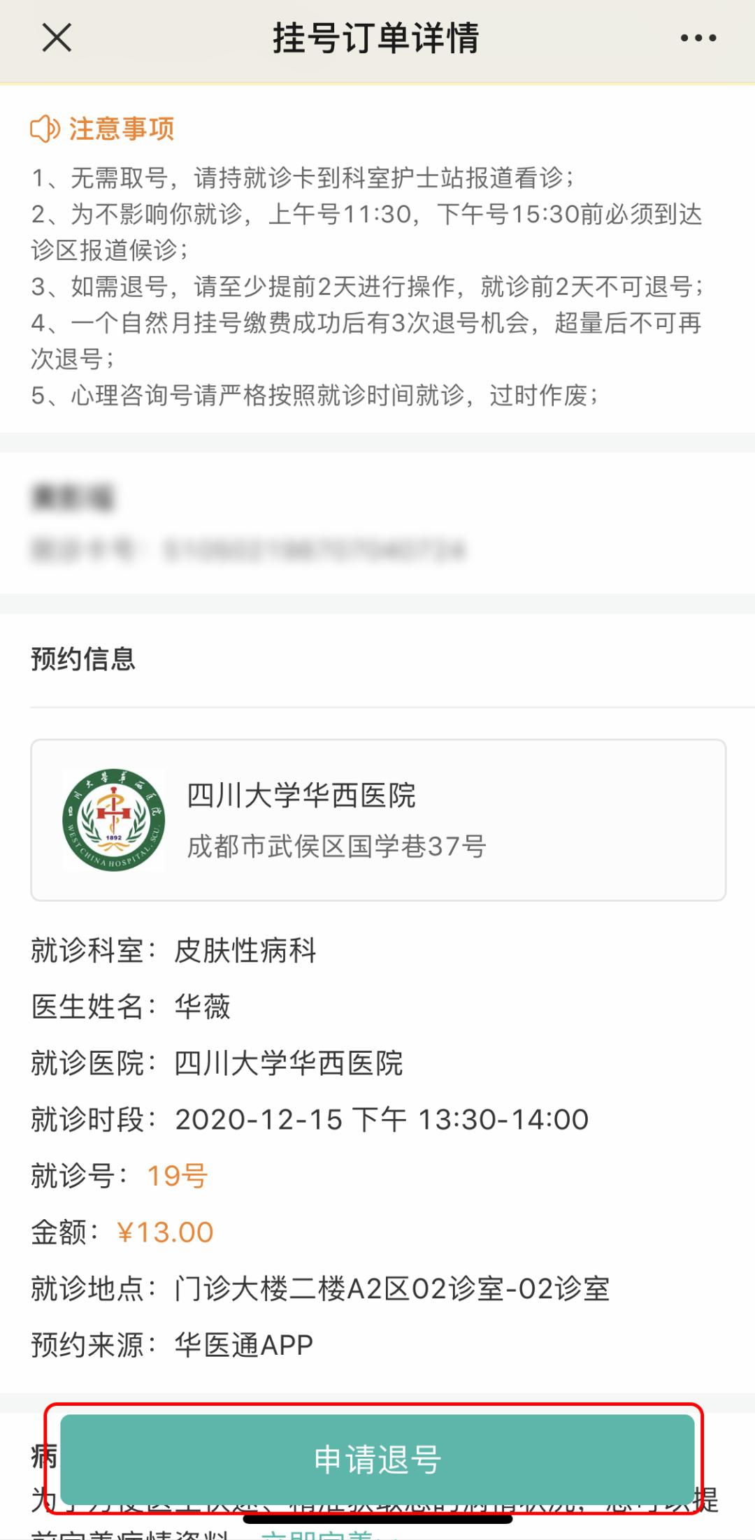 因疫情防控原因,四川大学华西医院于本周内(12月13日前)临时调整预约挂号的退号时间,由之前的需提前两天退号,调整为可提前一天退号,如本周因疫情不能来我院的已预约挂号患者,可提前一天按以下方式退号: