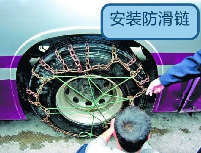 冰雪天气,应在出行之前安好防滑链,不要在遇到冰雪路面之后再安装,因为临时停车安装防滑链比提前安装麻烦,也不利于安全。安装、拆卸前要将车辆停放在安全地带。如在繁忙的路上,需要设置必要的交通警示标志。安装防滑链后,行驶速度一般不要超过每小时50公里,并注意尽可能避免突然加速或减速。并可考虑携带铁锹、铁镐等防滑工具。