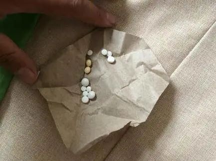 〓 杨刚展示医院给妻子开具的每日服用药物,均用粗粝的草纸团包裹。另有一个小药瓶,贴着写有“一天”字样的胶布,撕开显示,原包装就是胃药。