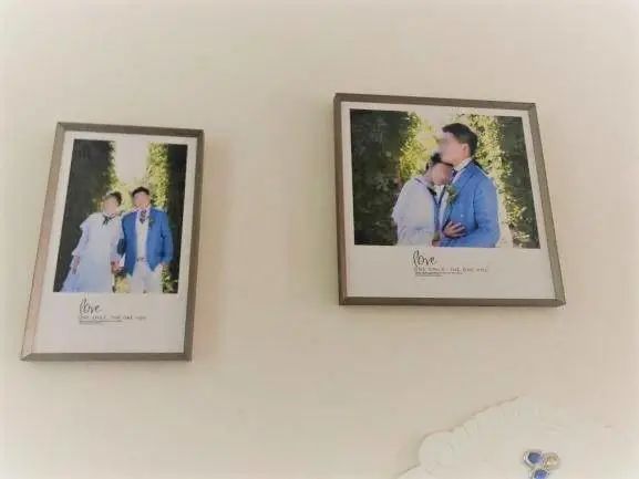 〓 杨刚家卧室墙面上的结婚照。
