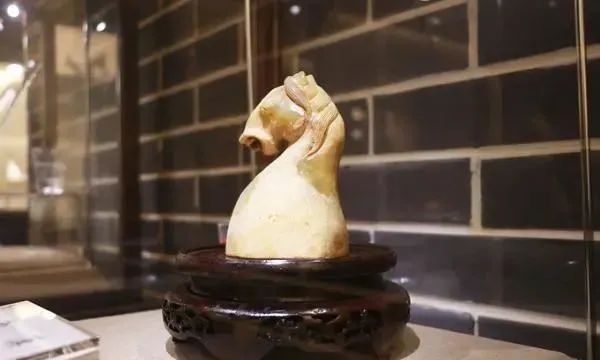 “这件藏品是西汉的和田黄玉马头。只允许汗血宝马编三个辫子,这是品牌的象征。发展到唐代,因为汗血宝马的品种减弱了,就允许优良品种的马编五个辫子。李白流传千古的一首诗,‘五花马,千金裘,呼儿将出换美酒,与尔同销万古愁。’中的‘五花马’就是编五个辫子的马。”