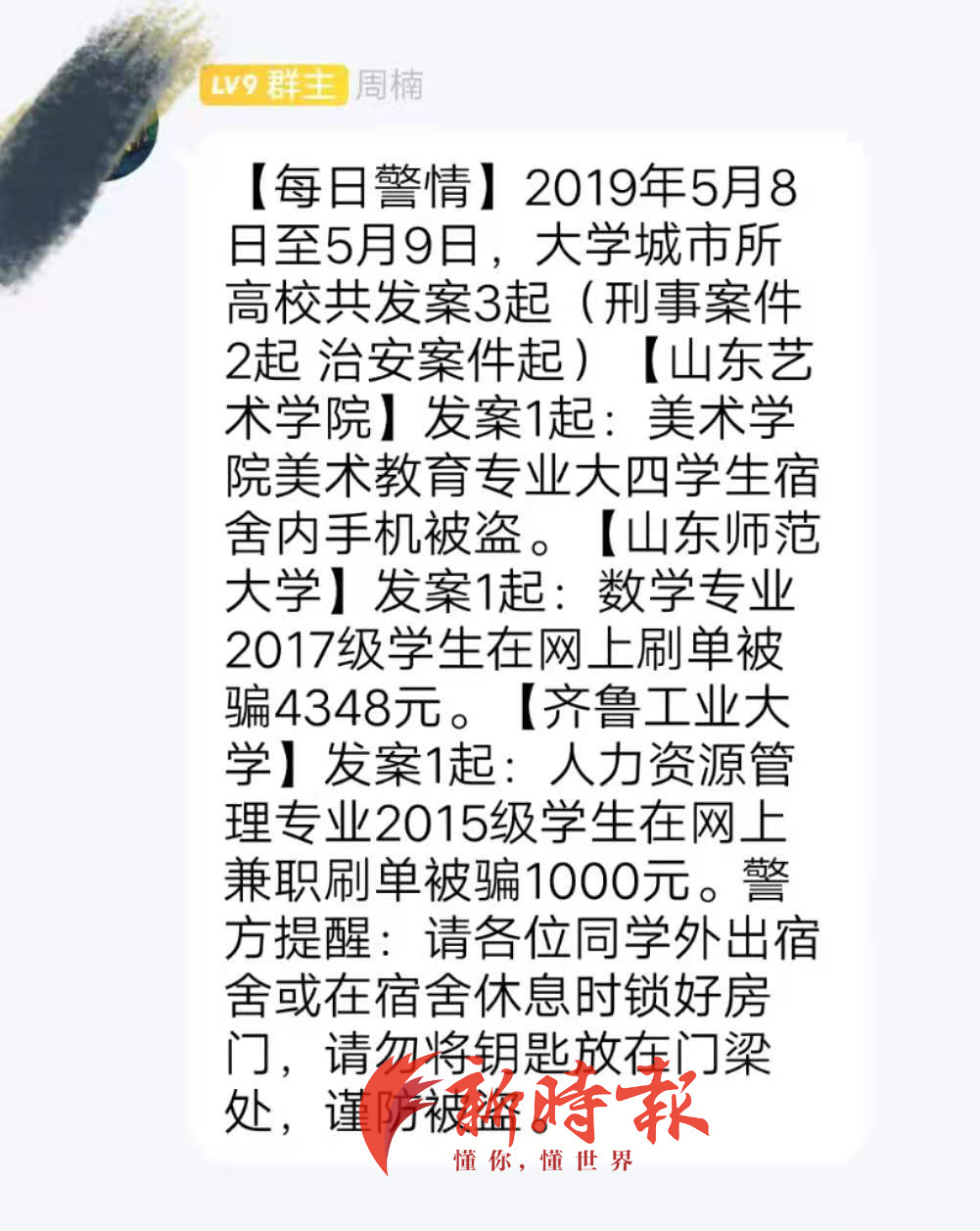 但对大学生的警示是一直在做的。山东师范大学辅导员周楠告诉新时报记者,新生入学的第一项工作就是安全知识教育,平时也会把一些“每日警情”发在自己所管年级群里,用现实的例子提醒同学们。