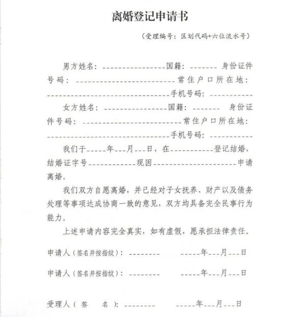 以下为民政部发布的最新离婚登记申请书范本↓↓