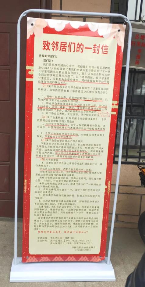 记者在社区门口看到,这里立了一块展示牌,上面有“华雅花园热心业主致邻居们的一封信”。
