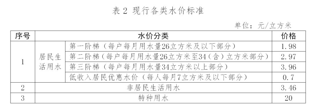 三级阶梯用水量部分分别对应执行三级价格:1.98元/立方米、2.97元/立方米、3.96元/立方米。暂未实现“抄表到户”居民用户执行第一级阶梯价格1.98元/立方米。非居民生活用水价格为3.46元/立方米,特种用水价格20元/立方米。