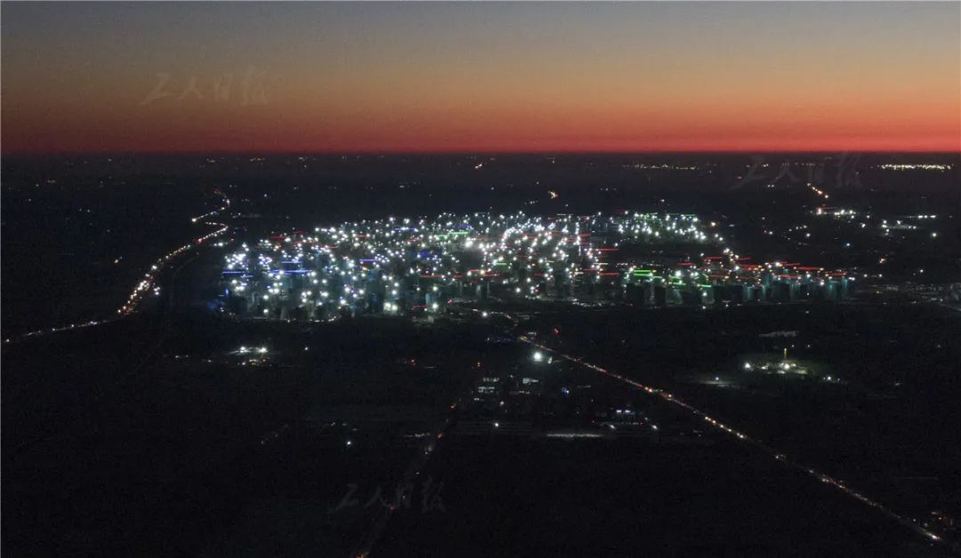 而在白洋淀往北不到10公里的容东片区,却完全是另一番景象:上千塔吊平地而起,夜色中如星光璀璨;各类重型施工车辆在钢板水泥铺就的临时道路上驶过,不间断地发出有节奏的轰鸣;工人们踏着尘土越过喧嚣,一拨拨排成长队穿梭于宿舍、工地和工友集市间……