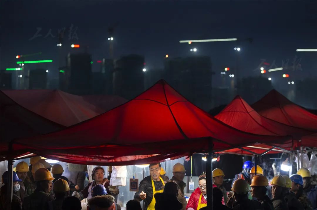 ▲12月5日,夜幕刚刚降临。雄安新区容东片区的一处工友集市内,在周边项目上作业的工友们汇集而来,在这里购买晚餐和一些生活用品。