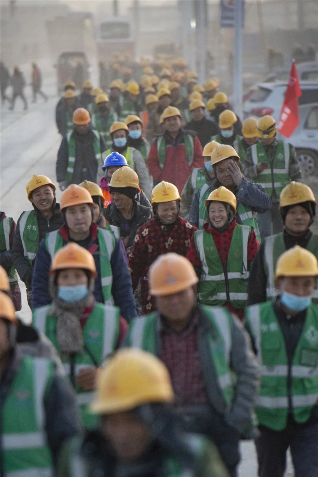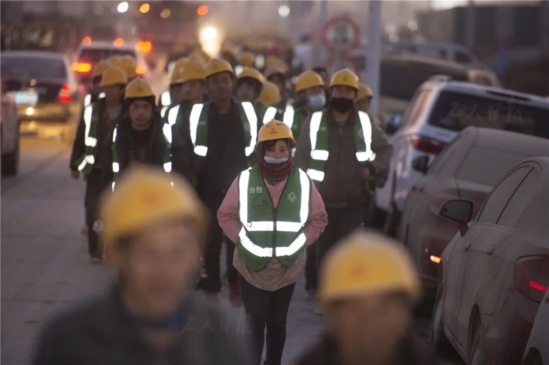 ▲12月3日傍晚,浩浩荡荡的工人队伍走在前往工友集市和宿舍的通道上。