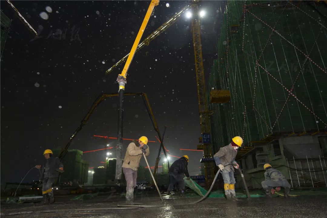 ▲12月1日23时,雄安新区夜间降雪,在中铁建工集团承建的容东片区E组团安置房项目上,混凝土浇筑作业照常进行。
