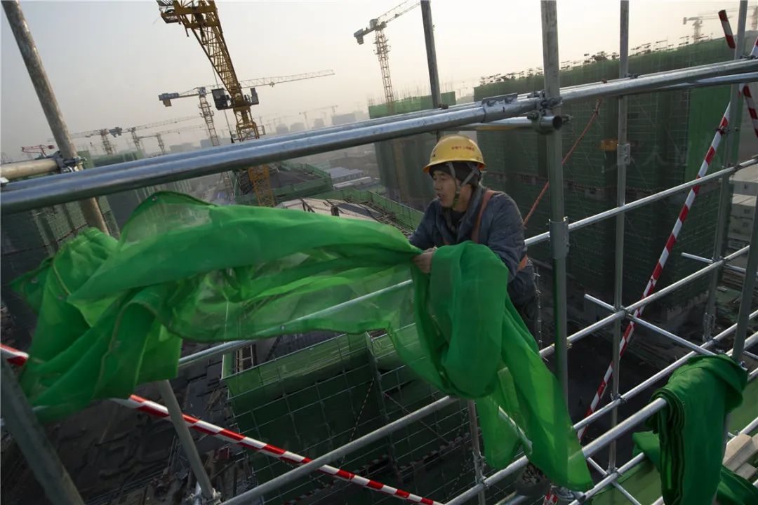 ▲12月6日,架子工叶建华在高楼上空铺设防护网。